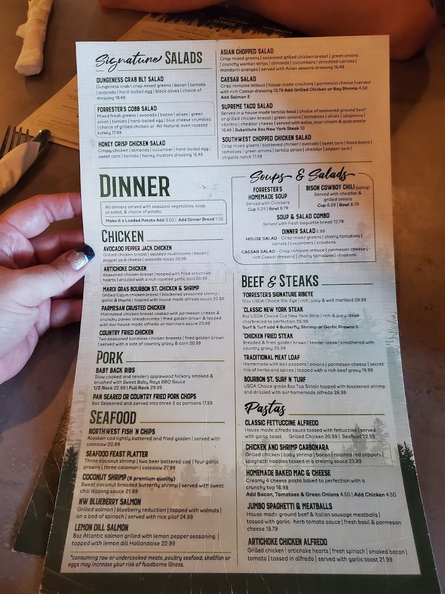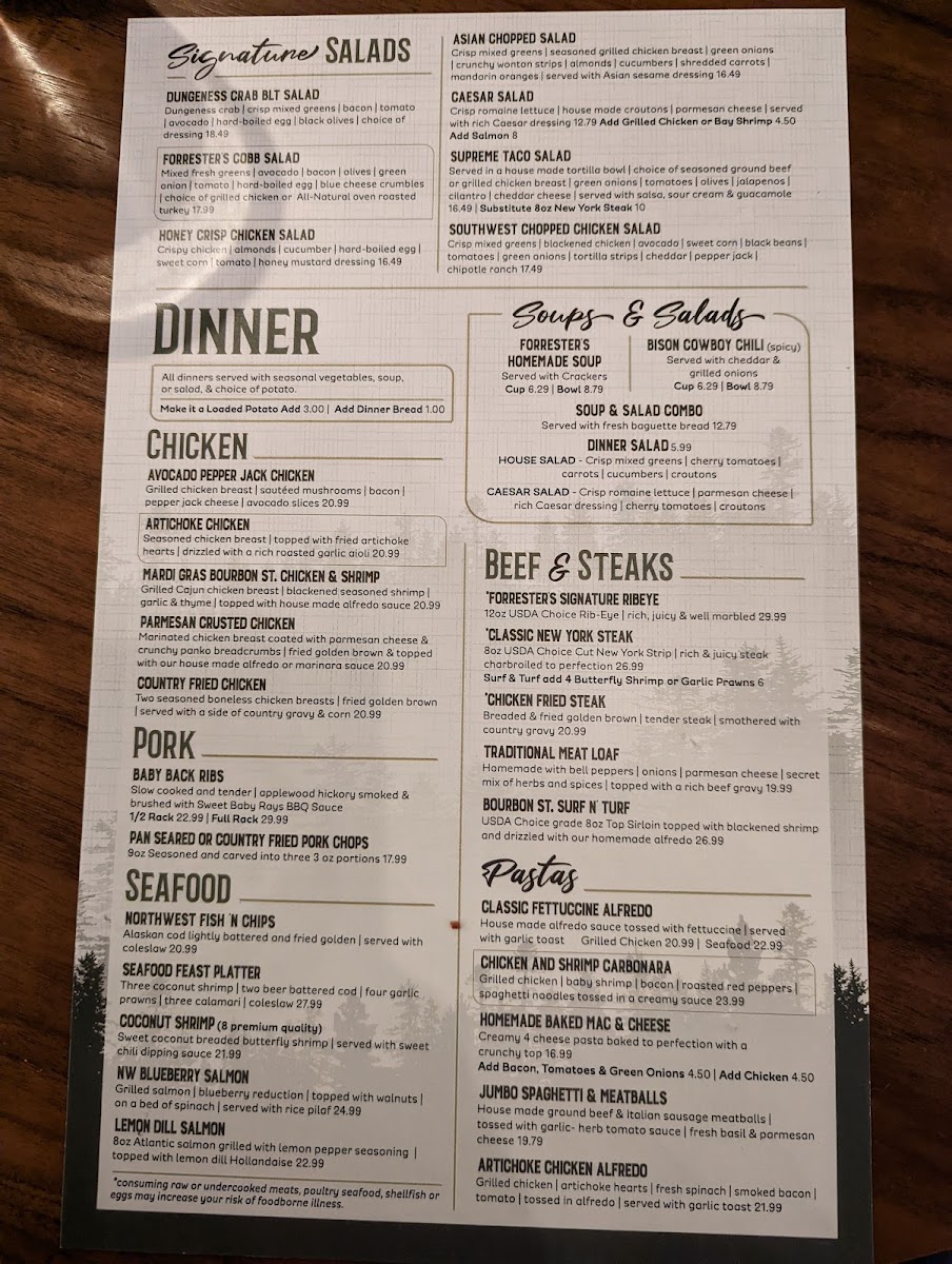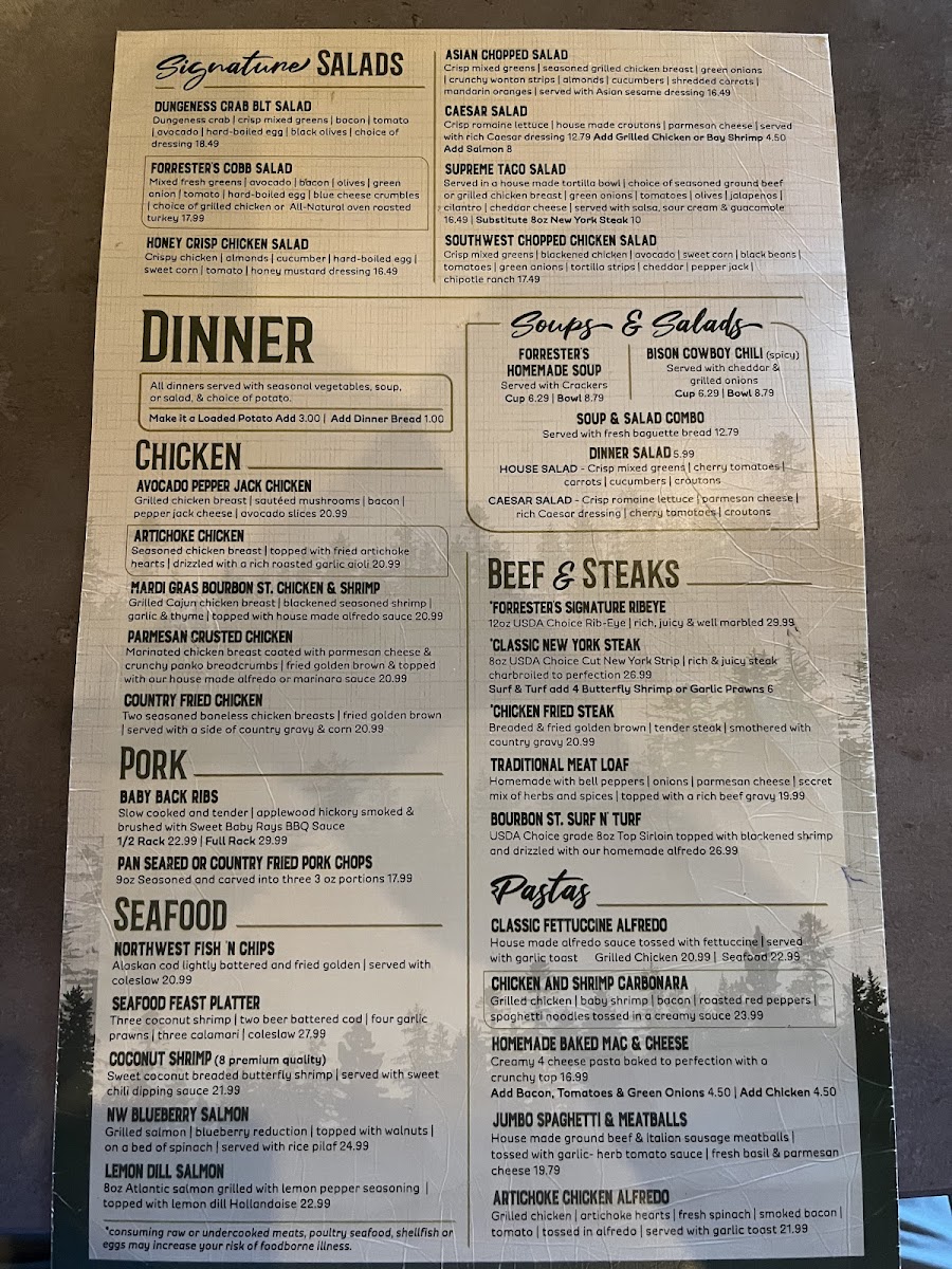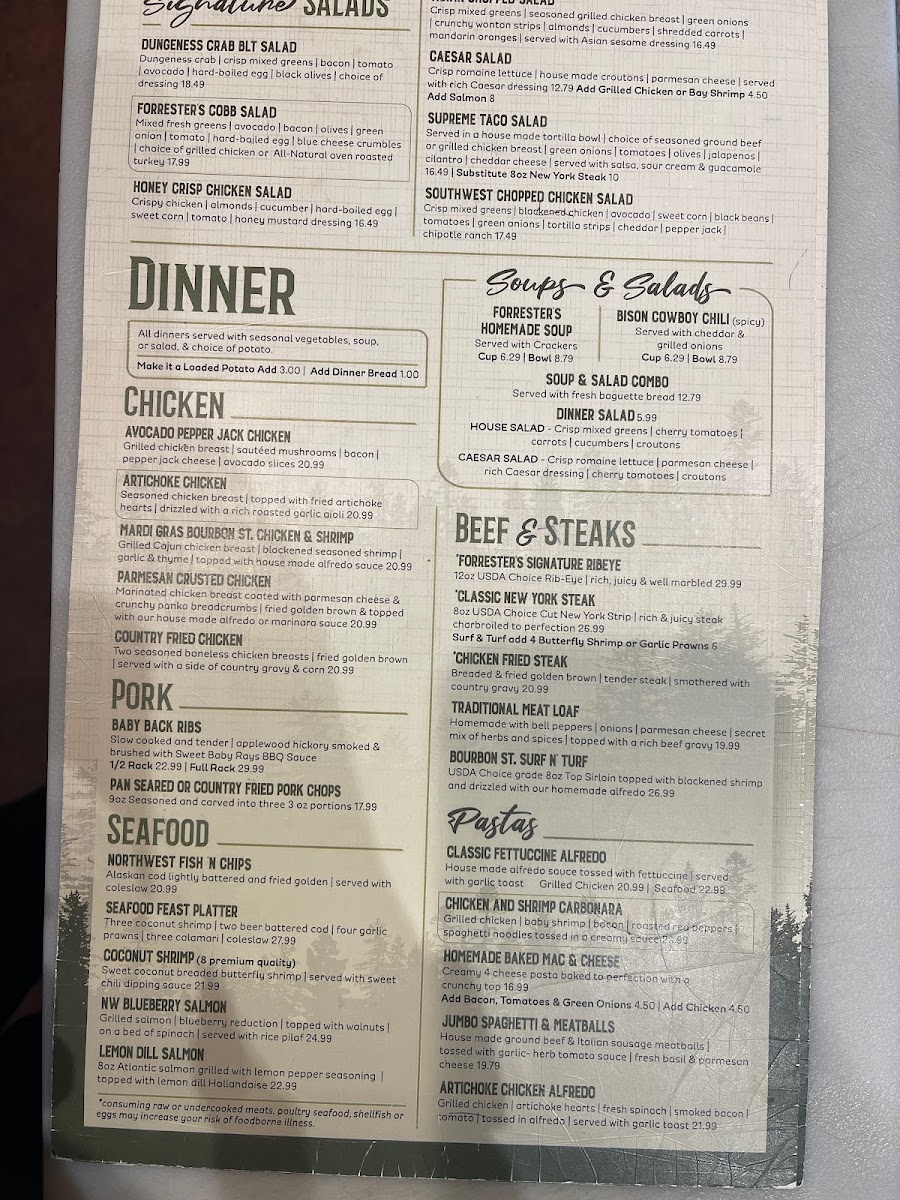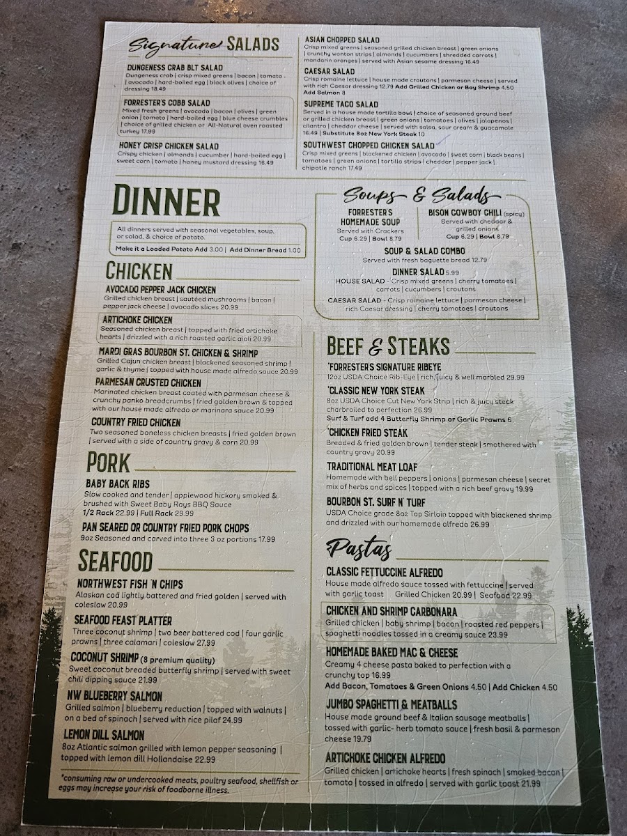 The restaurant also offers a variety of salads, including the Forrester's Cobb Salad and the Asian Chopped Salad, as well as chicken, pork, seafood, beef, and pasta dishes that are sure to please any palate. Whether you're in the mood for a classic steak dinner or a comforting bowl of homemade soup, Forrester’s Bar and Grill has something for everyone.